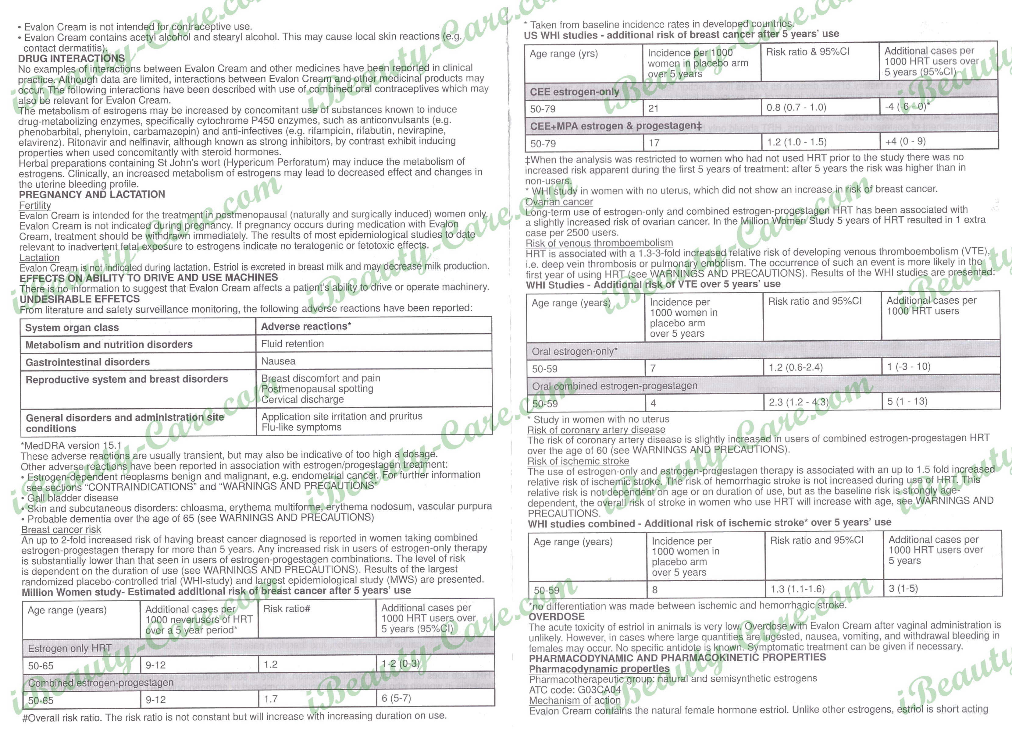 The excess risk becomes apparent within a few years of use but returns to baseline within a few (at most five) years after stopping treatment. HRT, especially estrogen-progestagen combined treatment, increases the density of mammographic images which may adversely affect the radiological detection of breast cancer. Clinical studies reported that the likelihood of developing increased mammographic density was lower in subjects treated with estriol than in subjects treated with other estrogens. It is unknown whether Evalon Cream carries the same risk. In a population-based casecontrol study in 3,345 women with invasive breast cancer and 3,454 controls, estriol was found not to be associated with an increased risk of breast cancer, in contrast to other estrogens. However, the clinical implications of these findings are as yet unknown. Therefore, it is important that the risk of being diagnosed with breast cancer is discussed with the patient and weighed against the known benefits of HRT.