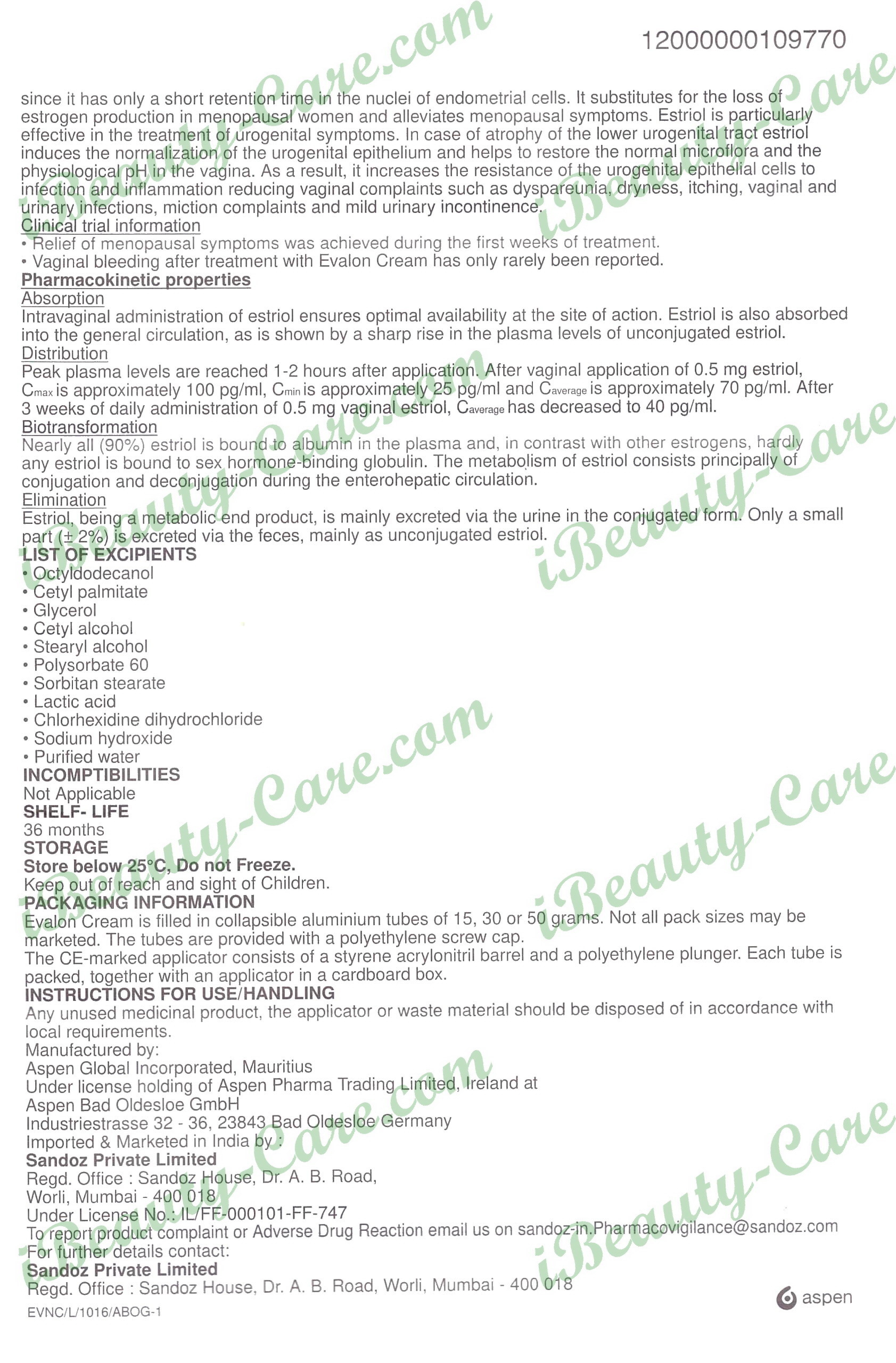 Evalon Cream / Generic Estrace contains the natural female hormone estriol. Unlike other estrogens, estriol is short acting since it has only a short retention time in the nuclei of endometrial cells. It substitutes for the loss of estrogen production in menopausal women and alleviates menopausal symptoms. Estriol is particularly effective in the treatment of urogenital symptoms. In case of atrophy of the lower urogenital tract estriol induces the normalization of the urogenital epithelium and helps to restore the normal microflora and the physiological pH in the vagina. As a result, it increases the resistance of the urogenital epithelial cells to infection and inflammation reducing vaginal complaints such as dyspareunia, dryness, itching, vaginal and urinary infections, miction complaints and mild urinary incontinence.