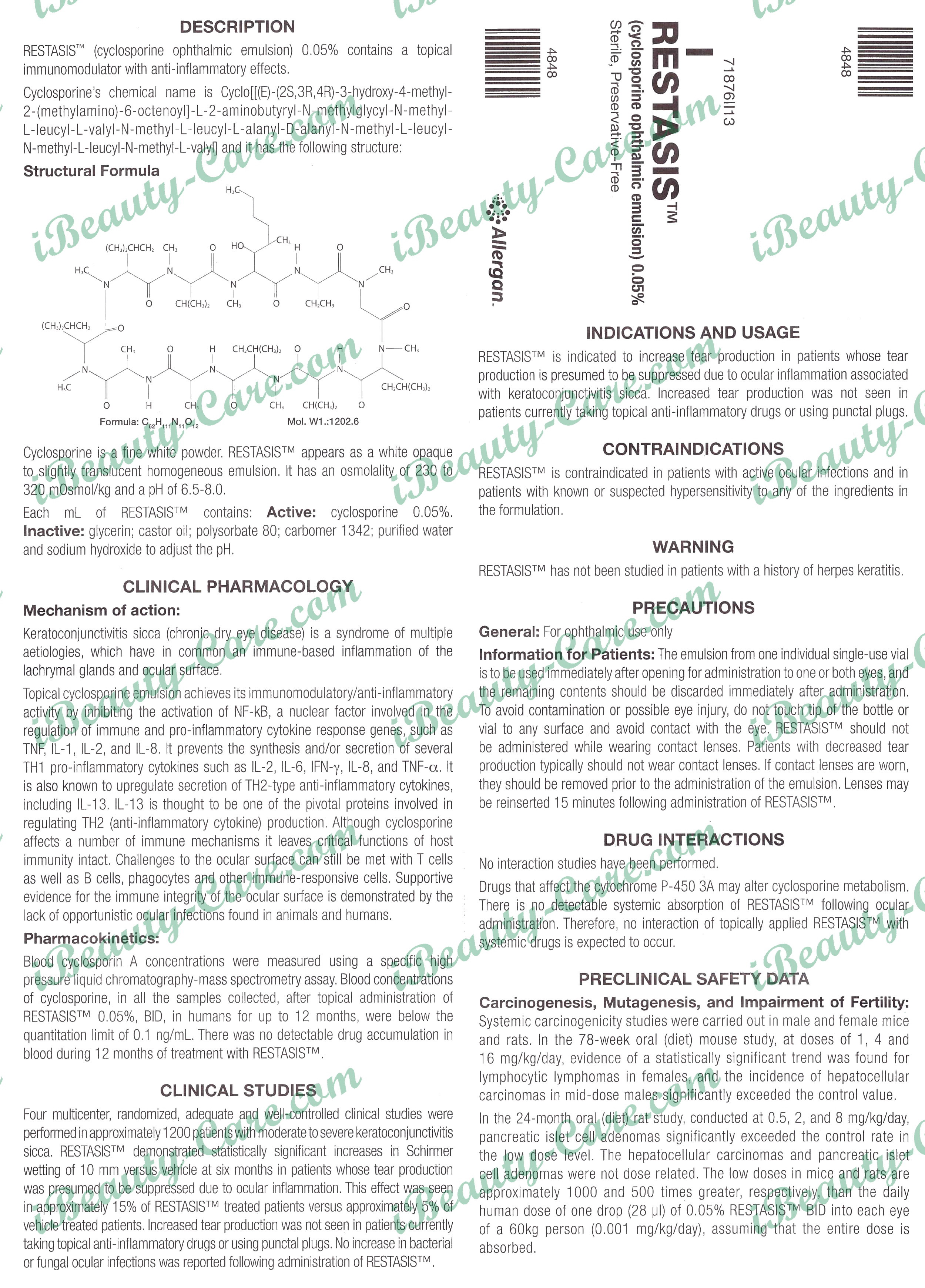 Each mL of RESTASIS™ contains: Active: cyclosporine 0.05%. Inactive: glycerin; castor oil; polysorbate 80; carbomer 1342; purified water and sodium hydroxide to adjust the pH.
