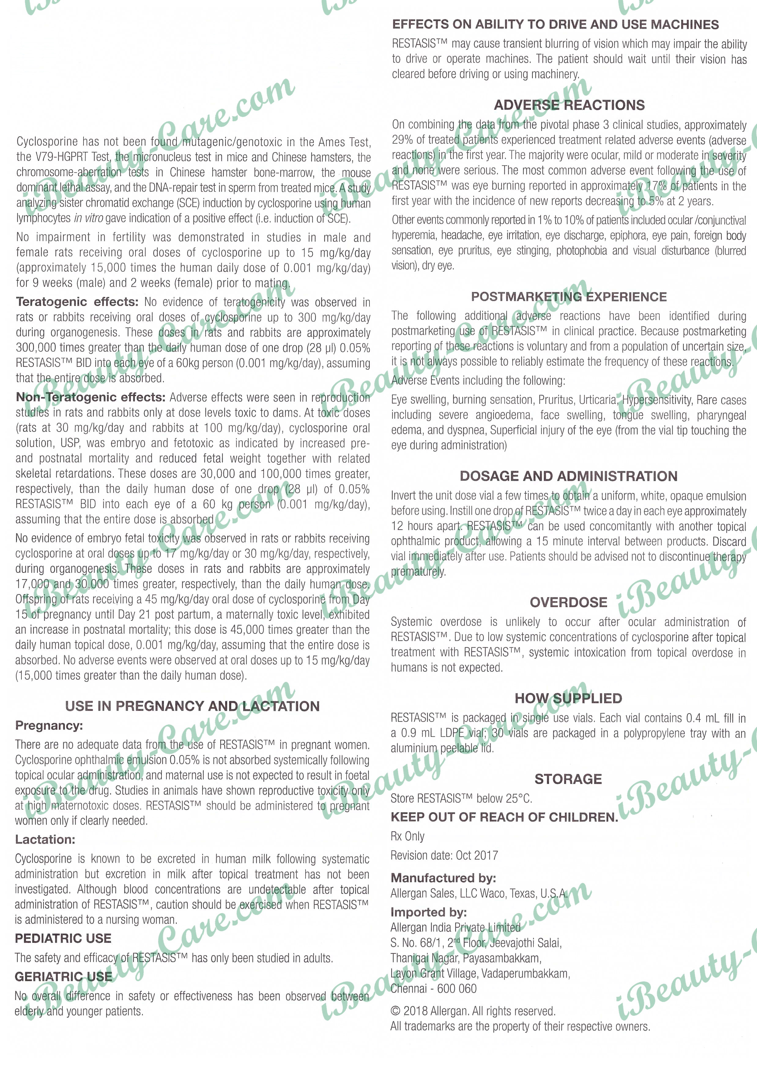 Indication - Restasis is indicated to people with dry eye or need to control inflammation of the eye or any such conditions that requires suppression of immune response.