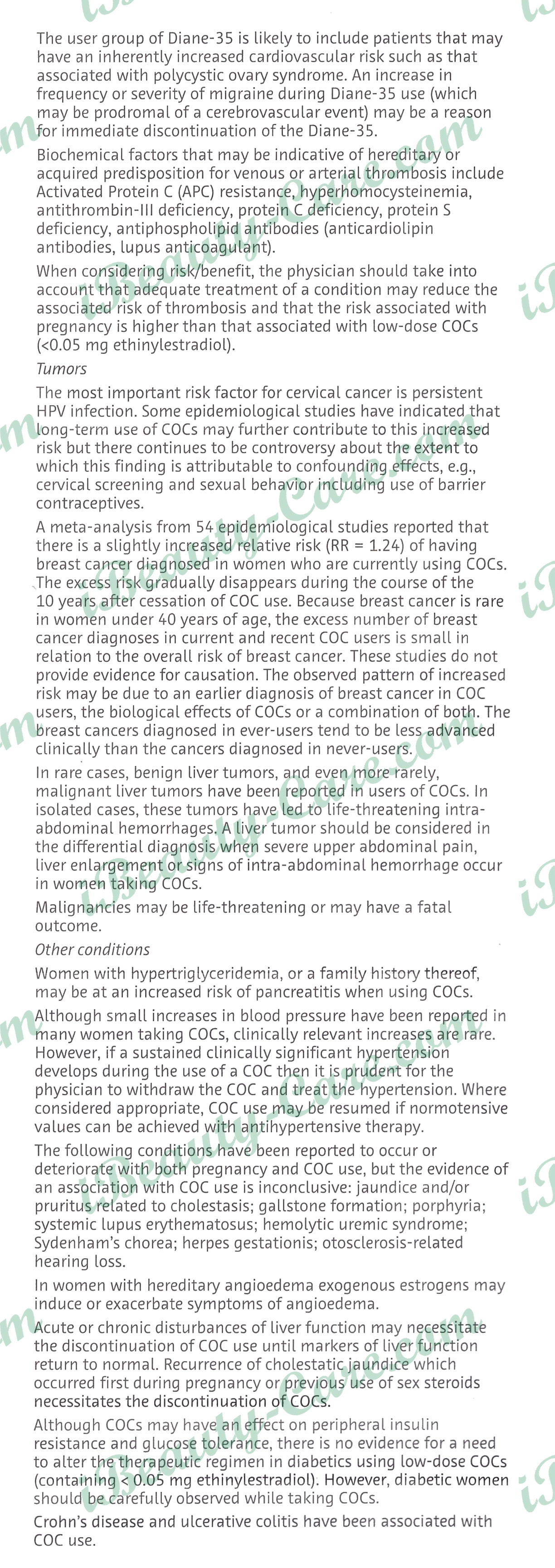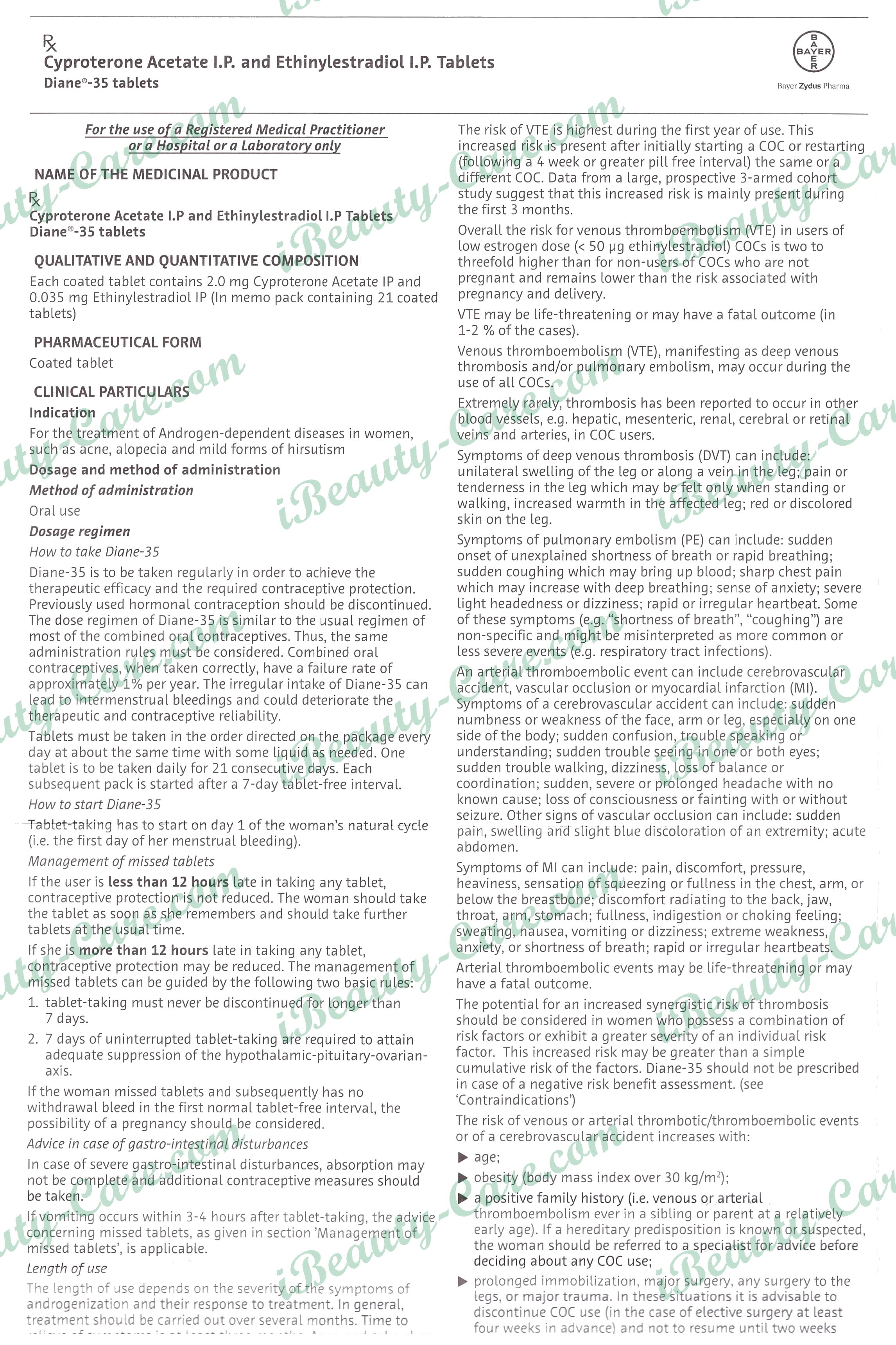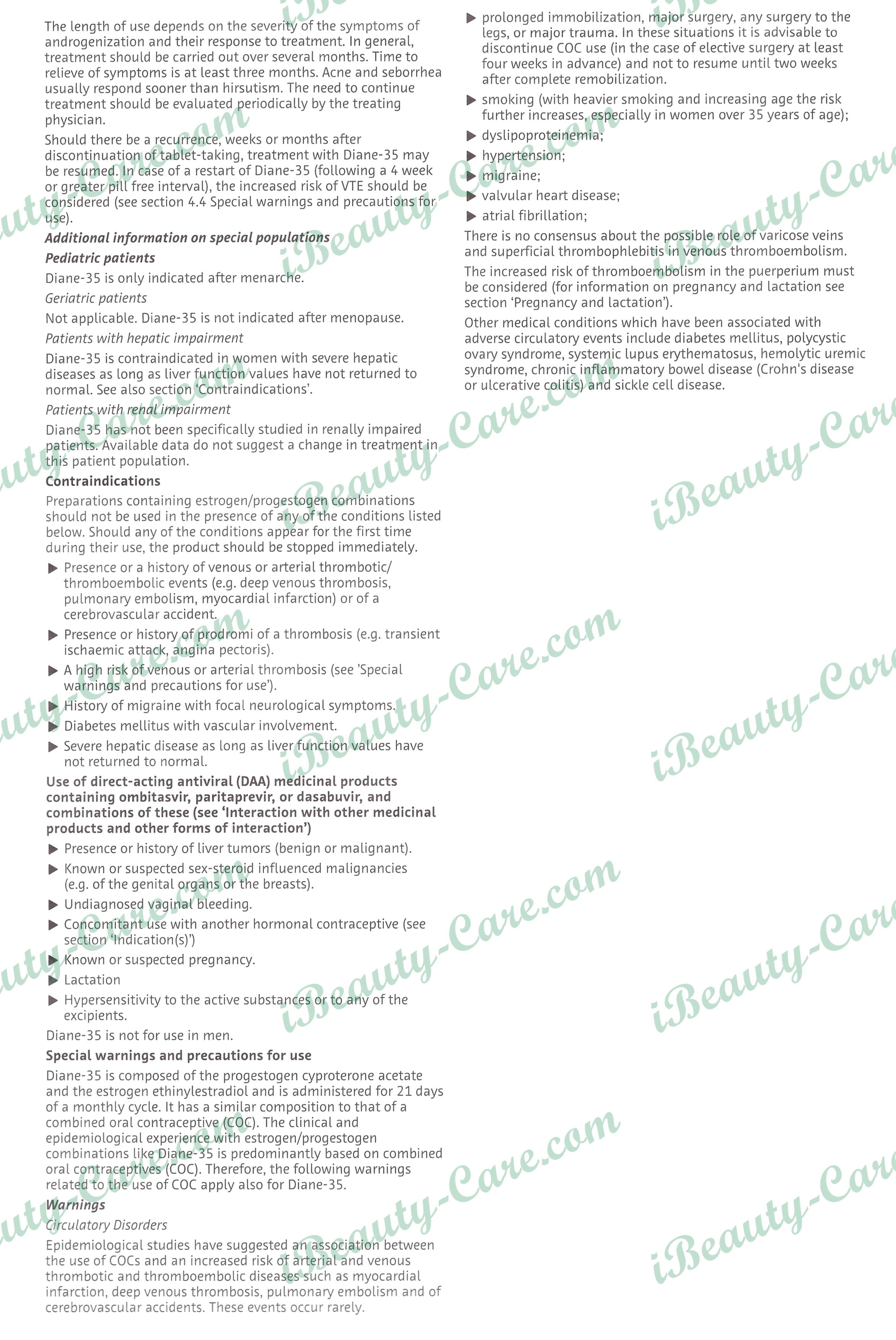 Diane-35 is composed of the progestogen cyproterone acetate and the estrogen ethinylestradiol and is administered for 21 days of a monthly cycle. It has a similar composition to that of a combined oral contraceptive (COC). The clinical and epidemiological experience with estrogen/progestogen combinations like Diane-35 is predominantly based on combined oral contraceptives (COC). Therefore, the following warnings related to the use of COC apply also for Diane-35.