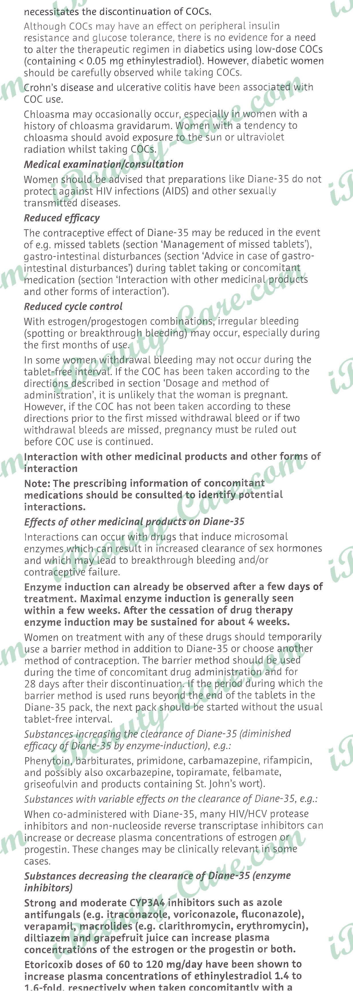Drug interaction - The contraceptive effect of Diane-35 can be reduced by the concomitant use of drugs that accelerate the breakdown of these hormones. These agents include barbiturates group of drugs; the antibiotics rifampicin, ampicillin, and tetracyclines; antivirals such as ritonavir and nelfinavir; the fungicide Griseofulvin; anticonvulsant drugs; phenylbutazone agents used in gouts; and activated carbon.