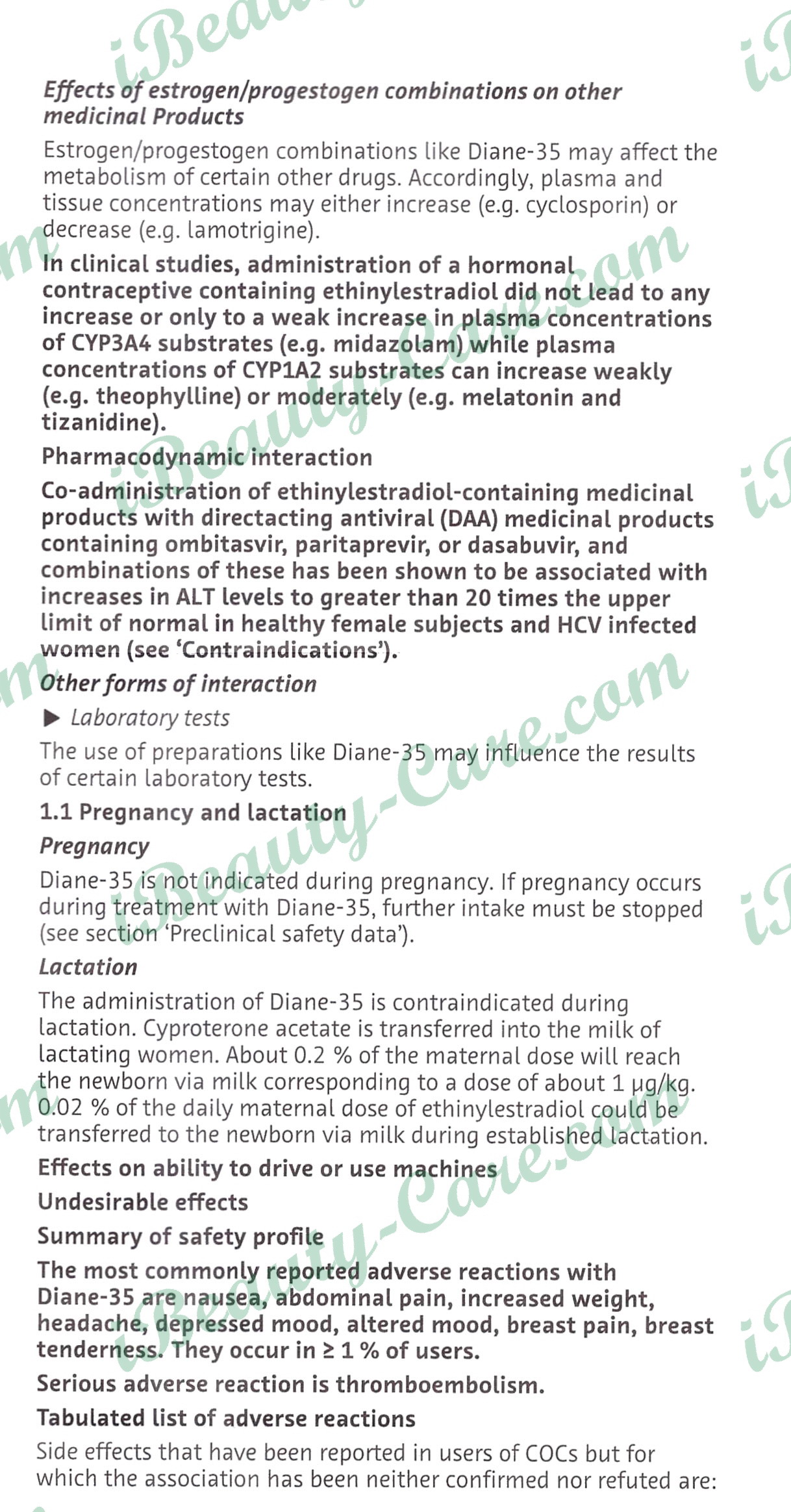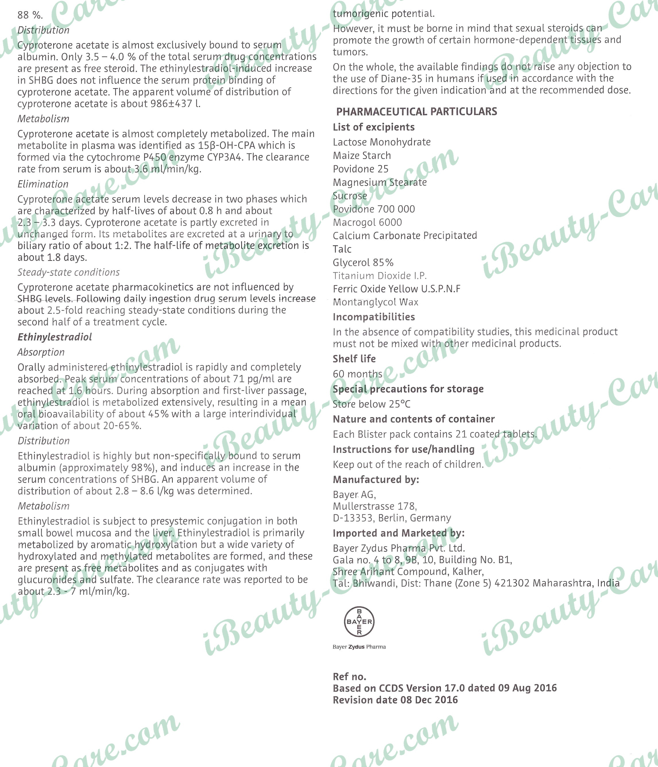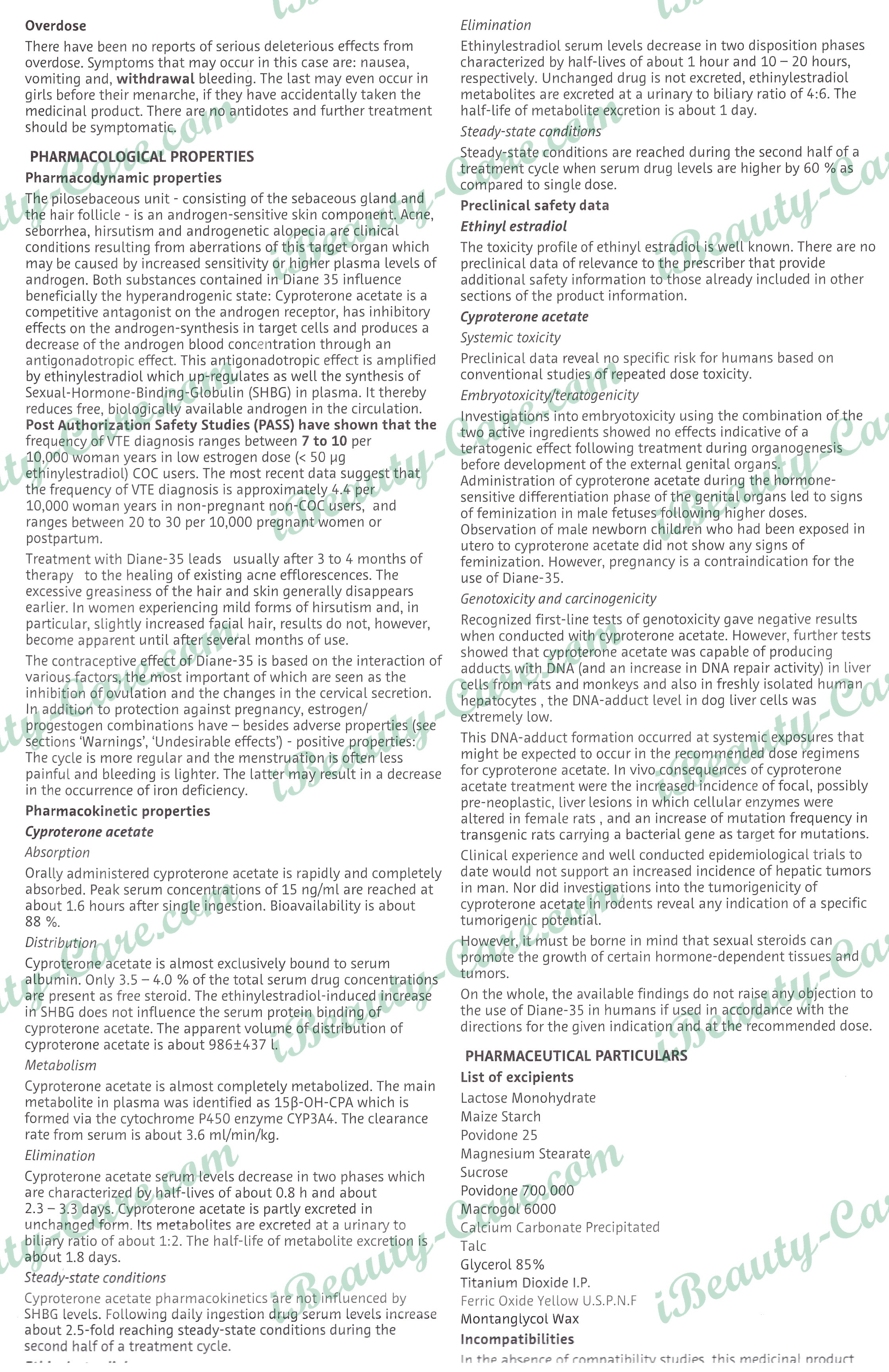Qualitative and quantitative composition - Each tablet of Diane-35 contains 2 mg cyproterone acetate and 0.035 mg Ethinylestradiol. Non-medicinal ingredients included are corn starch, lactose, magnesium stearate, povidone, and talc; the coating used contains calcium carbonate, yellow iron oxide, glycerol, polyethylene glycol, povidone, sucrose, talc, titanium dioxide, and wax.